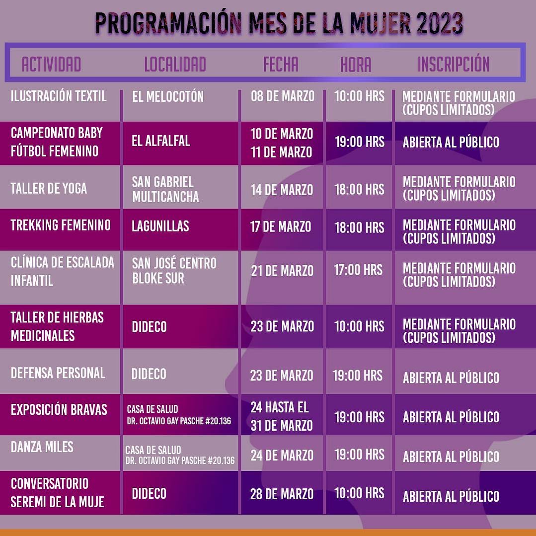 Es así que en las comunas de la Provincia Cordillera, Pirque, Puente Alto y San José de Maipo, se realizarán talleres, exposiciones, salidas al aire libre, actividades deportivas, feria de la mujer, creación de record guinness de más de 100 mujeres que crearán la arpillera más grande, entre muchas otras.