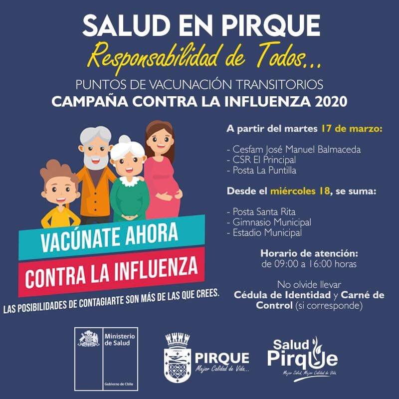 Desde este lunes, el Municipio de Pirque, suspenderá todas las actividades recreativas, deportivas, eventos, viajes y reuniones, con el objetivo de minimizar el riesgo de contagio dentro de la comunidad pircana. Desde donde enfatizaron que, en especial los adultos mayores, permanezcan en sus casas. De esta manera, dispuso que para todos los funcionarios municipales sobre los 60 años mujeres y 65 años hombres, podrán desarrollar sus labores desde sus hogares.