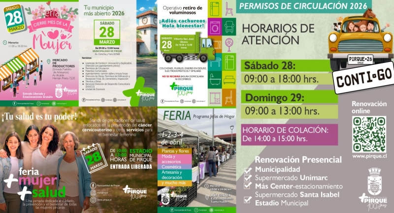 La agenda se concentrará principalmente este sábado 28 de marzo en distintos puntos de la comuna. La programación incluye servicios municipales, feria de emprendedoras, una jornada de salud femenina y operativo de retiro de enseres, además de horarios extendidos por permisos de circulación.