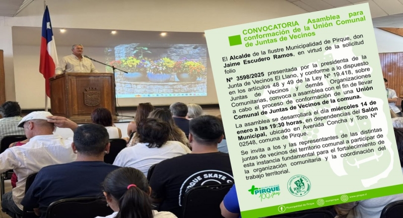 La instancia fue convocada por el alcalde Jaime Escudero y se realizará el miércoles 14 de enero a las 19:30 horas en el Salón Municipal. El proceso busca avanzar en la conformación de la Unión Comunal de Juntas de Vecinos de Pirque.