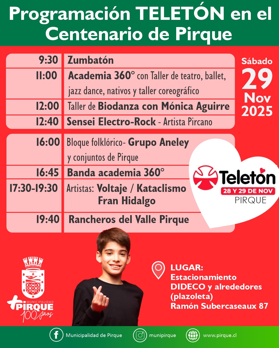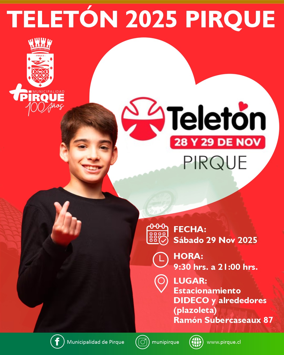 Este sábado 29 de noviembre, Pirque será escenario de una nueva versión de la Teletón local, actividad que este año se integra a la conmemoración de los 100 años de la comuna. La jornada incluirá presentaciones artísticas, talleres y espacios de encuentro familiar, con el objetivo de promover la participación comunitaria y recaudar aportes para la campaña solidaria.