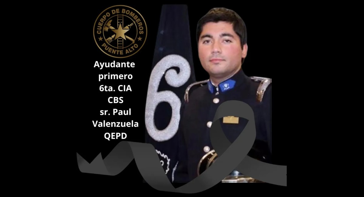 El Cuerpo de Bomberos de Puente Alto expresó públicamente sus condolencias por el fallecimiento del Ayudante Primero Paul Cristóffer Valenzuela Muñoz (Q.E.P.D.), voluntario de la Sexta Compañía del Cuerpo de Bomberos de Santiago, quien perdió la vida mientras cumplía funciones en un procedimiento de emergencia en la capital.