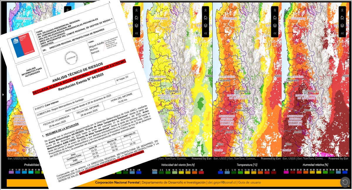 El Servicio Nacional de Prevención y Respuesta ante Desastres (SENAPRED) declaró Alerta Roja Regional por calor extremo para la Región Metropolitana de Santiago, de acuerdo con el análisis técnico de riesgos contenido en la Resolución Exenta N°94/2025. La medida fue adoptada en coordinación con la Delegación Presidencial Regional y la Seremi de Salud, a raíz del pronóstico de altas temperaturas informado por la Dirección Meteorológica de Chile.