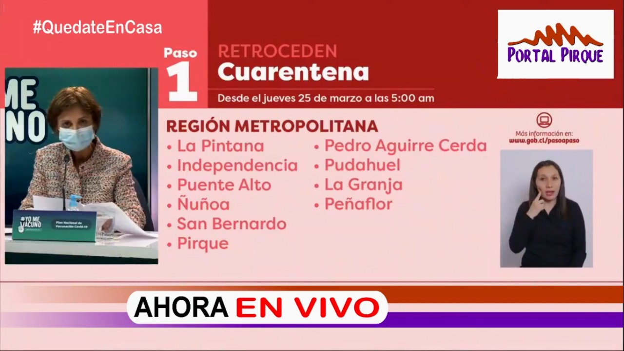 En la Región Metropolitana, son 21 comunas más que se agregan a esta medida de confinamiento, las que serían Cerro Navia. Maipú. Lo Espejo. La Reina. Macul. San Joaquín. El Monte. Melipilla. Estación Central. San Pedro. Peñalolén. La Pintana. Independencia. Puente Alto. Ñuñoa. San Bernardo. Pirque. Pedro Aguirre Cerda. Pudahuel. La Granja. Peñaflor.