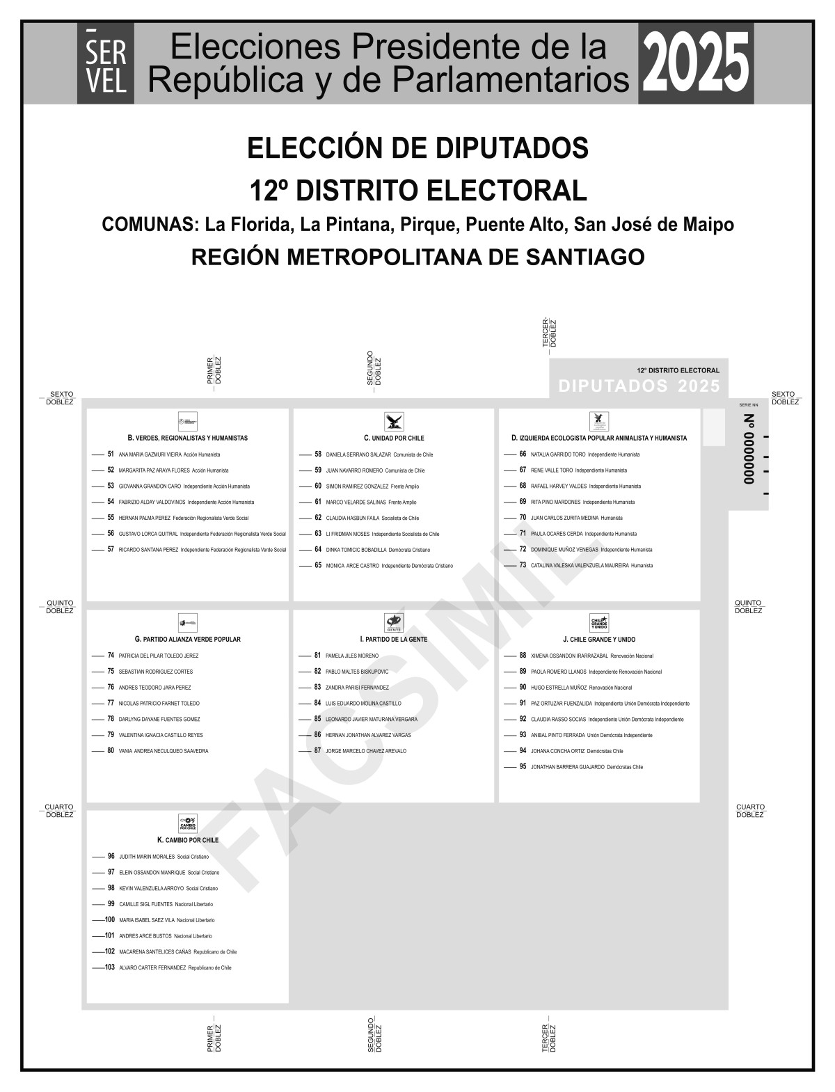 Este domingo 16 de noviembre se llevarán a cabo las Elecciones Presidenciales y Parlamentarias 2025, instancia en la que 52 candidatos competirán por un escaño en la Cámara de Diputadas y Diputados, representando al Distrito 12, que agrupa a las comunas de La Florida, La Pintana, Pirque, Puente Alto y San José de Maipo.