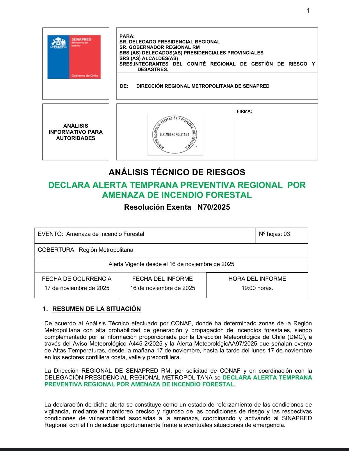 De acuerdo con el análisis técnico realizado por CONAF, diversas zonas de la Región Metropolitana presentan una alta probabilidad de generación y propagación de incendios forestales. Esta información fue complementada con los avisos meteorológicos A445-2/2025 y A97/2025 emitidos por la Dirección Meteorológica de Chile, los cuales proyectan un evento de altas temperaturas desde hoy 17 de noviembre hasta la tarde de este mismo día, afectando sectores de cordillera de la costa, valle y precordillera.