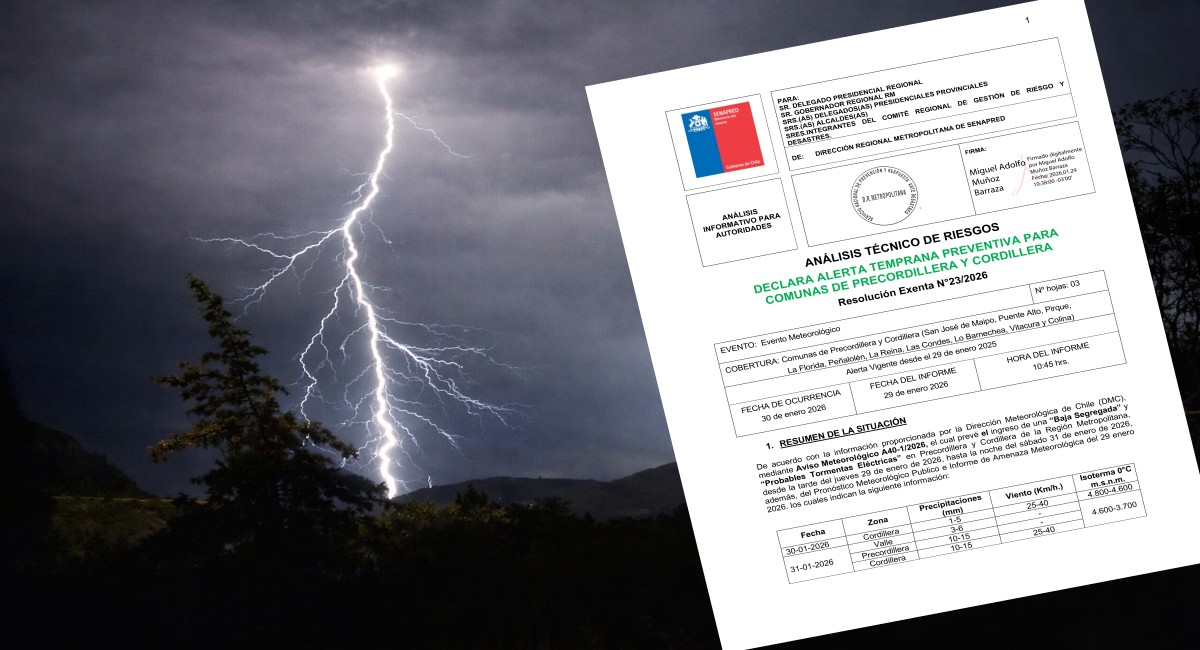 La Dirección Regional Metropolitana del Servicio Nacional de Prevención y Respuesta ante Desastres (SENAPRED) declaró Alerta Temprana Preventiva para las comunas de San José de Maipo, Puente Alto, Pirque, La Florida, Peñalolén, La Reina, Las Condes, Lo Barnechea, Vitacura y Colina, ante el pronóstico de un evento meteorológico que considera probables tormentas eléctricas, precipitaciones y rachas de viento, entre este viernes 29 y el sábado 31 de enero.