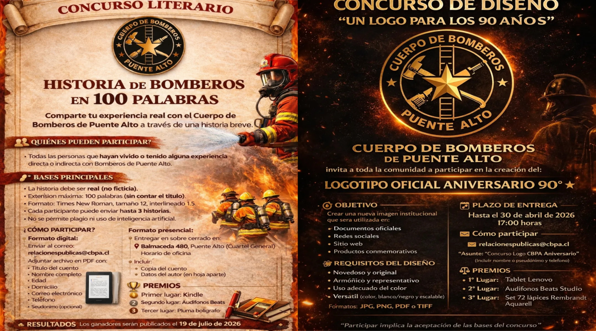 En el marco de la conmemoración de su 90° aniversario, el Cuerpo de Bomberos de Puente Alto abrió dos concursos dirigidos a la comunidad: uno literario titulado “Historias de Bomberos en 100 Palabras” y otro de diseño para crear el logotipo oficial de la celebración.