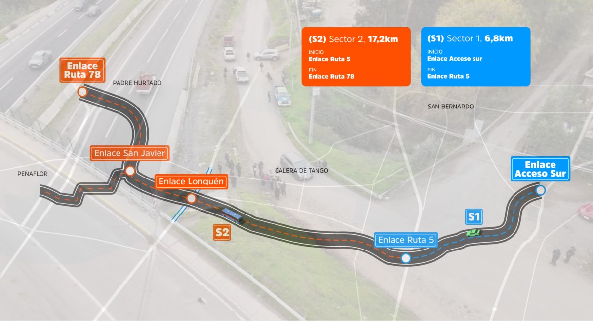 El proyecto Orbital Sur, impulsado por el Ministerio de Obras Públicas, contempla la construcción de una autopista de aproximadamente 24 kilómetros que conectará la Ruta 79 (Acceso Sur), la Ruta 5 y la Ruta 78, atravesando comunas como San Bernardo, Calera de Tango y Peñaflor. La iniciativa forma parte de un segundo anillo vial metropolitano que busca mejorar la conectividad y reducir la congestión en las principales vías de Santiago.